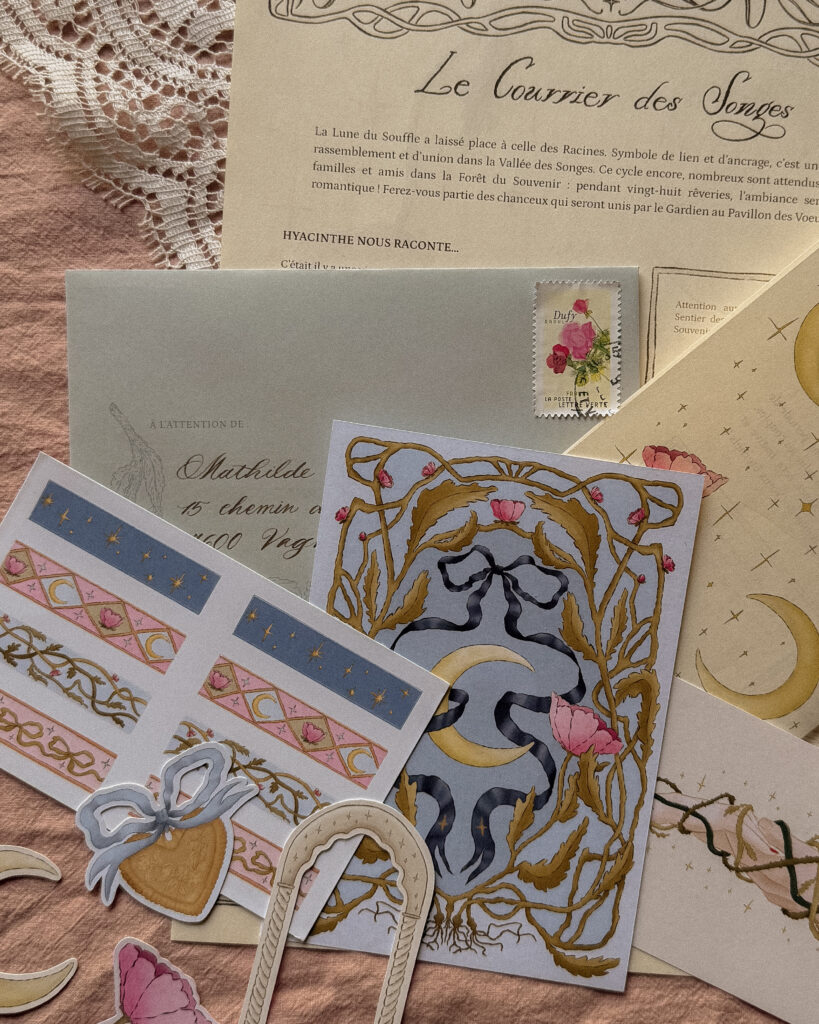Pensé pour offrir une parenthèse de douceur et d’enchantement à ton quotidien, tu reçois une jolie enveloppe, calligraphiée et décorée (évidemment !) et remplie de trésors illustrés tels que des cartes et autocollants. Le tout est accompagné d’un texte narratif pour t’immerger dans l’univers de la Vallée des Songes (une lettre, un bout d’histoire, un extrait de journal, une invitation, etc.), qui donne le thème à l’ensemble du courrier.