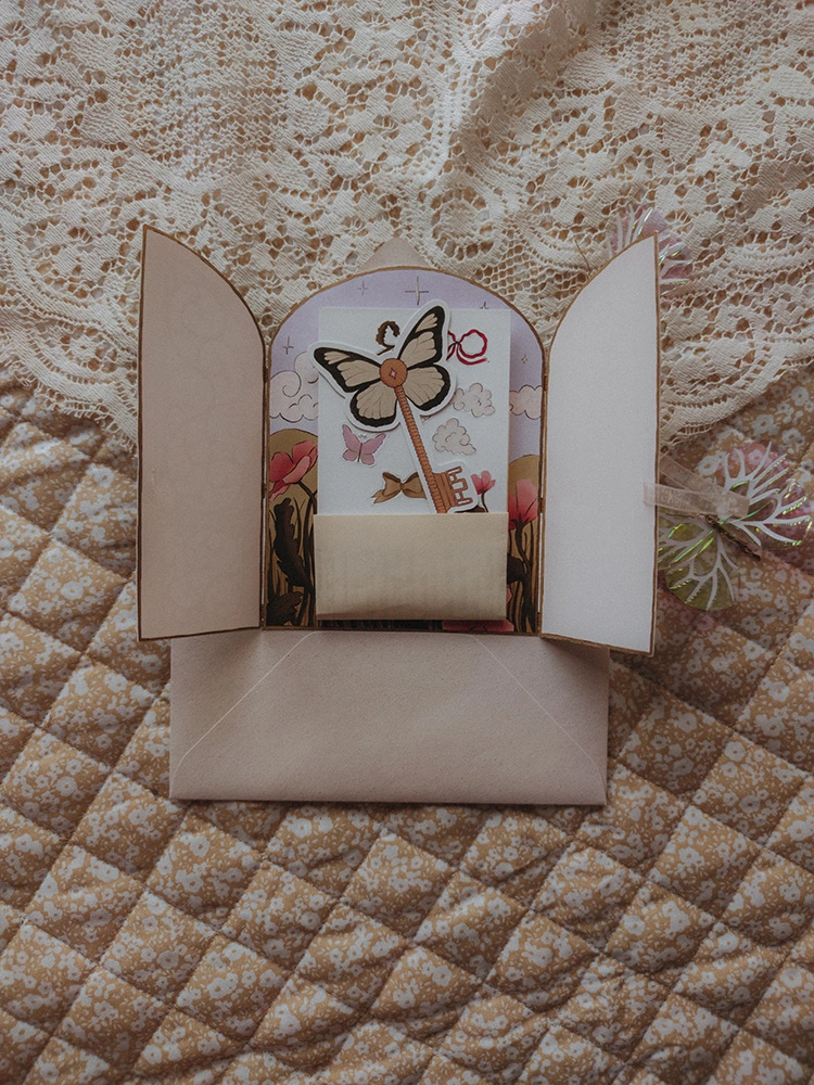 J’ai choisi de les placer sous le signe de l’arrivée dans la Vallée des Songes : des Clefs d’Entre-Deux, précieux sésames pour y entrer et ne pas s’y perdre, un portail qui s’ouvre sur un monde merveilleux, et mes vœux pour toi, glissés dans une multitude de petits détails faisant écho aux valeurs et aux promesses d’Atelier Callifée.